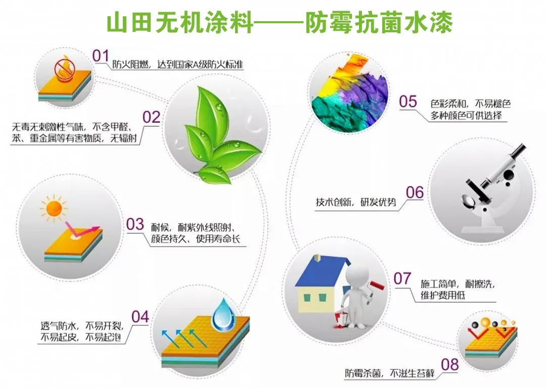 山田无机涂料采用了氧化改性水性矿物涂料,绿色环保,并具有广谱抗菌性。