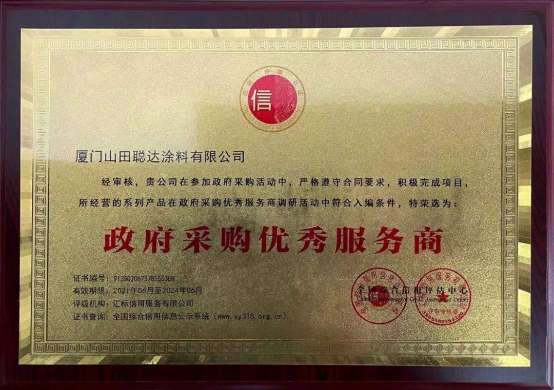 本次“政府采购优秀服务商”的审核认定,不仅是政府对山田水漆的价值与产品质量的高度肯定,更是为企业与政府之间的长期合作搭建了有效沟通的平台,山田水漆也将继续秉承“高标准、高质量、严要求”的合作信念,完成政府及各合作伙伴的采购与服务等工作。
