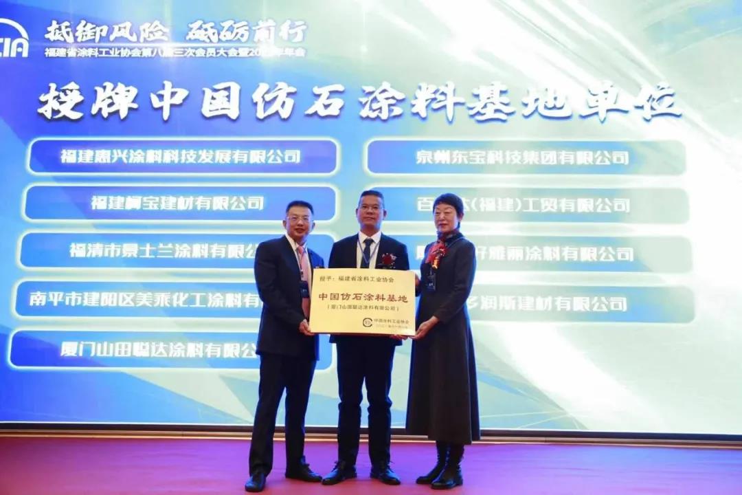 本次大会最大的亮点是“中国仿石漆基地授牌仪式”。中国涂料工业协会会长孙莲英向福建省涂料工业协会颁发“中国仿石漆基地”牌匾,并对福建省涂料工业协会会员单位授予“中国仿石漆基地生产企业”牌匾。“中国仿石漆基地”落户厦门山田聪达涂料有限公司,这是继山田水漆获得中国仿石漆质量标准起草单位后的另一荣誉。