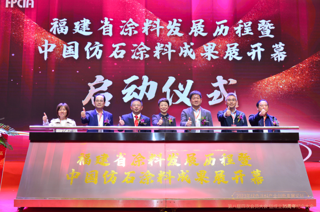 下午,大会正式开始,主持人宣布“福建省涂料发展历程暨中国仿石漆涂料成果展”开幕,中国涂料工业协会名誉会长孙莲英、福建省标准化研究所所长梁静、福建省石油化工行业协会秘书长郭辉、漳州市国有程溪农场党委书记李晓川及我会名誉会长王诗榕、会长施义民、监事长郑崇雄、秘书长叶建等领导上台揭幕。与此同时,“中国仿石涂料基地”仿石涂料福建省《仿石涂料应用技术规程》团体标准正式宣布启动。