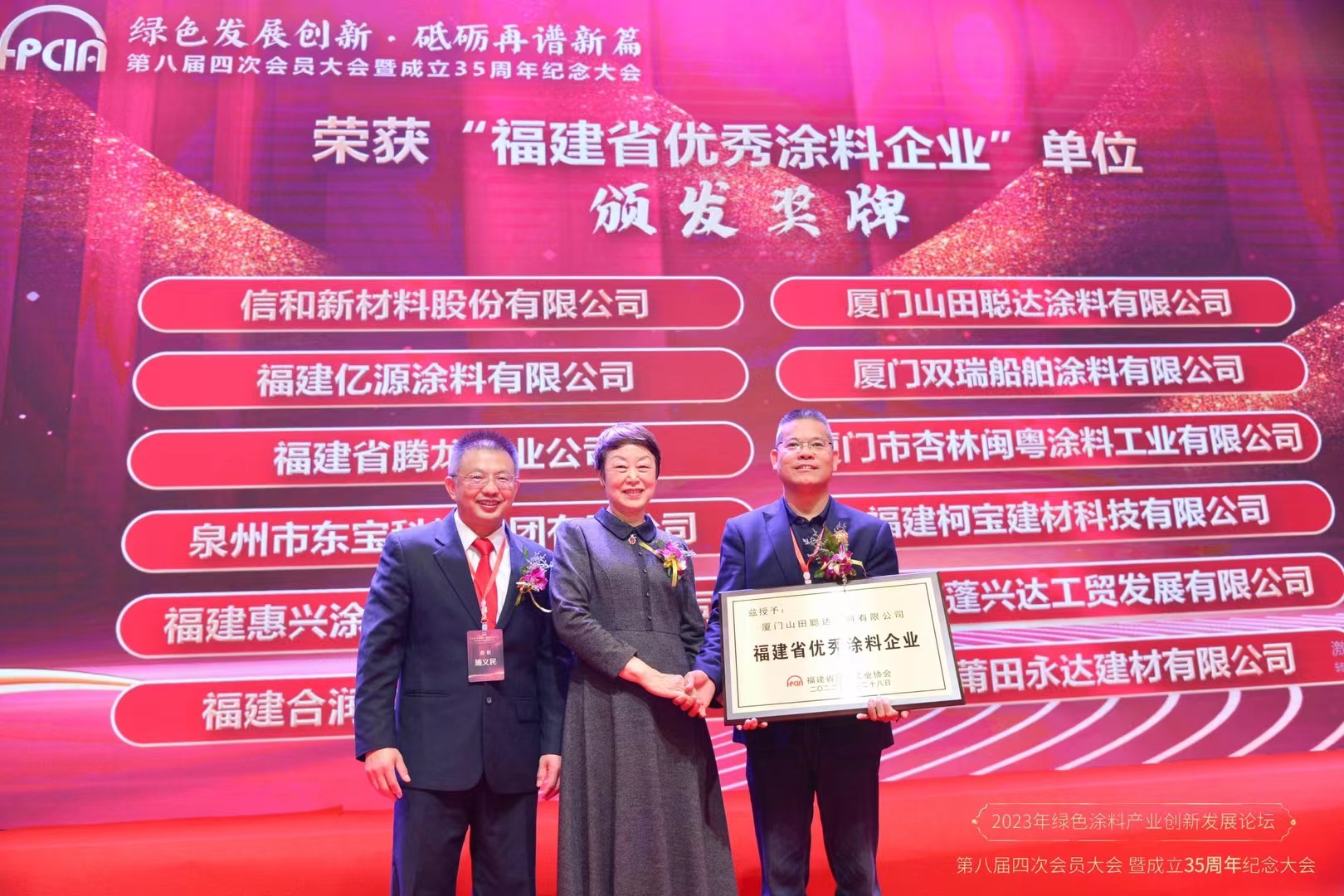 凭借在涂料领域的卓越品质和服务,山田水漆再次荣获“福建省优秀涂料企业”的荣誉称号。山田水漆将与其他成员单位共同推进环保涂装服务的升级,共同突破涂装新材料、工艺和理念的新挑战。同时也感谢协会领导长期以来对企业的帮助和支持。
