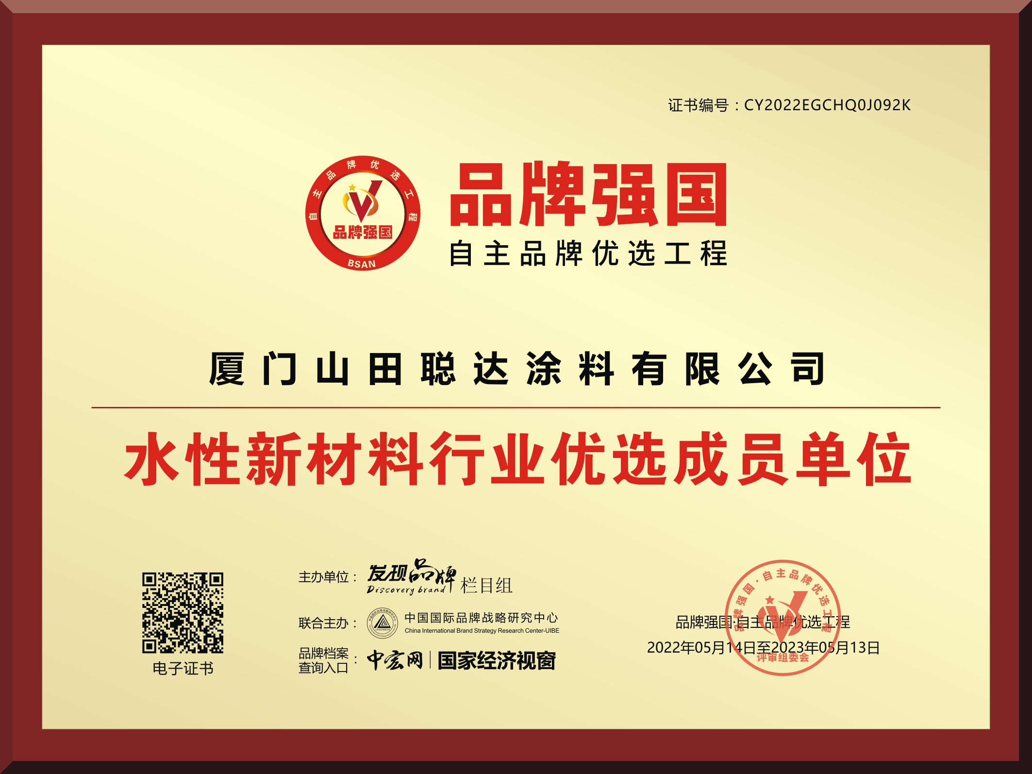 品牌核心价值可以帮助企业提升消费者对品牌的认知度、信任度、满意度,这是企业塑造品牌的重要性,更是品牌带来的力量。作为行业标杆品牌,山田水漆深知品牌发展的重要意义,自成立以来,一路践行着“精诚做事、诚信做人、持续改进、追求完美”的核心价值观,在现有产品的基础上结合市场需求和品牌定位,不断提升产品品牌核心价值,全面优化企业品牌形象。2022年山田水漆经过资质审核、层层筛选,从众多优秀品牌中脱颖而出,成功入选品牌强国工程水性新材料行业优选示范工程单位,在国家级平台向公众展示优选品牌形象。
